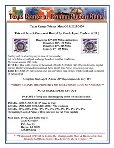 Entry Fee: $225.00 per bird due after the December 10 activation race and must be received before December 27 or they will be sold, and ownership of the bird lost.